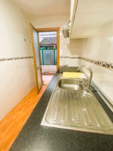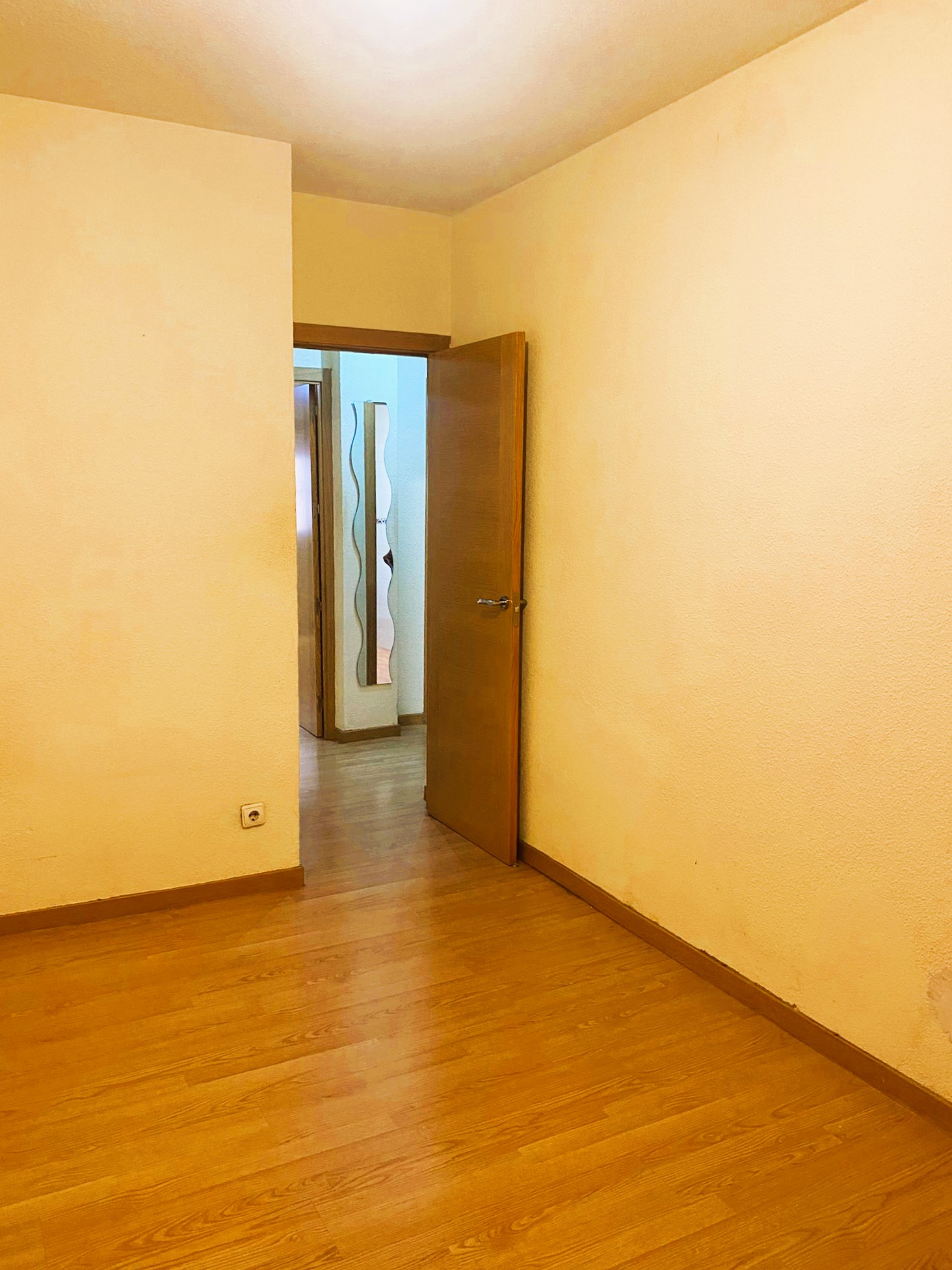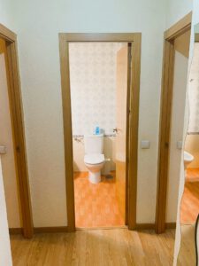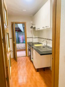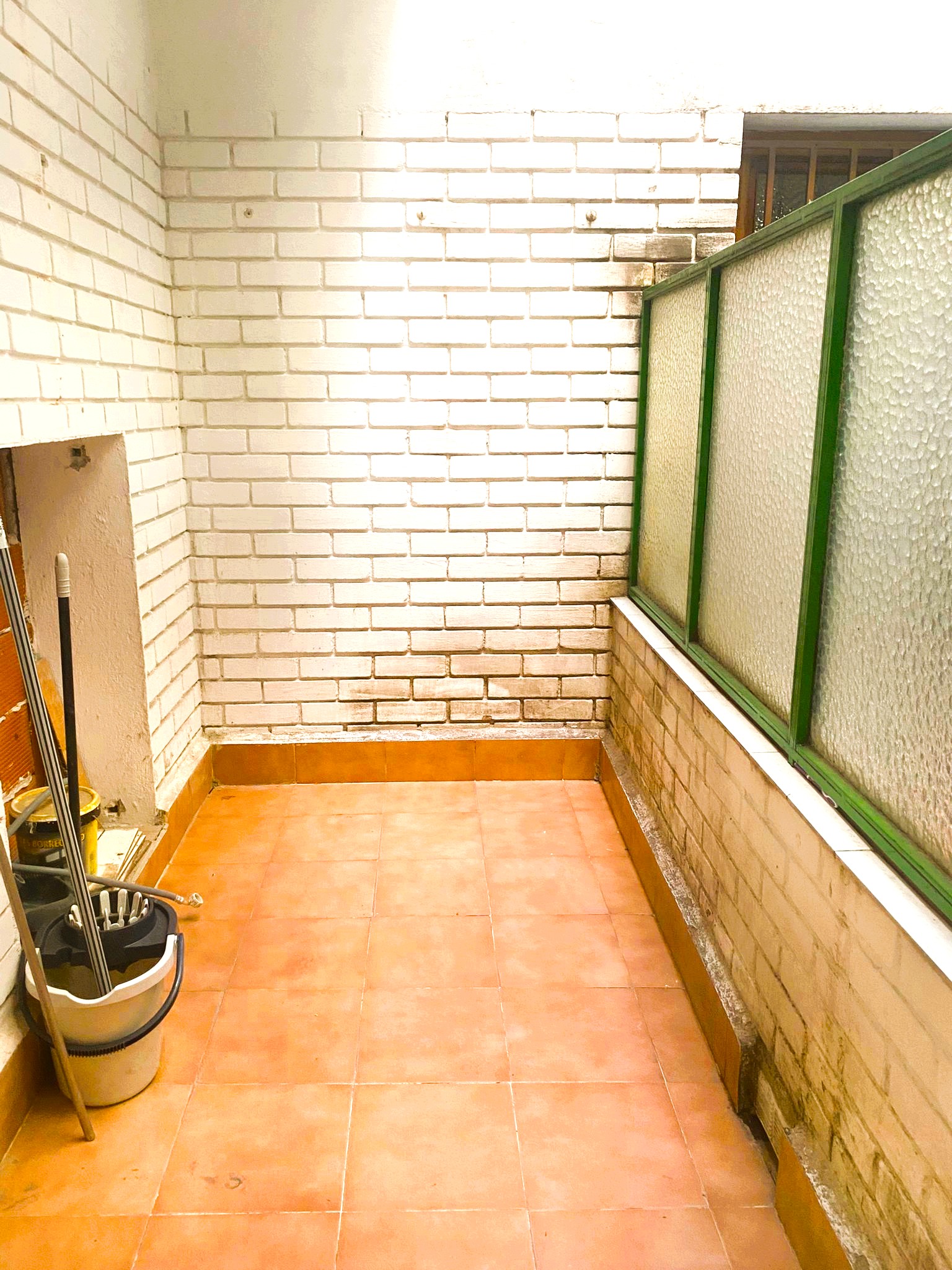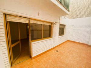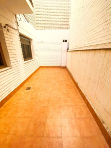Se trata de una vivienda interior de planta muy cuadrada, lo que garantiza la ventilación cruzada y una buena iluminación. Se distribuye de forma simétrica. Frente a la puerta de entrada, está el baño. Y a ambos lados del pasillo, se encuentran las dos habitaciones enfrentadas y el salón y la cocina de la misma forma. A través del salón, se accede a uno de los patios y por la cocina, se accede al segundo patio.